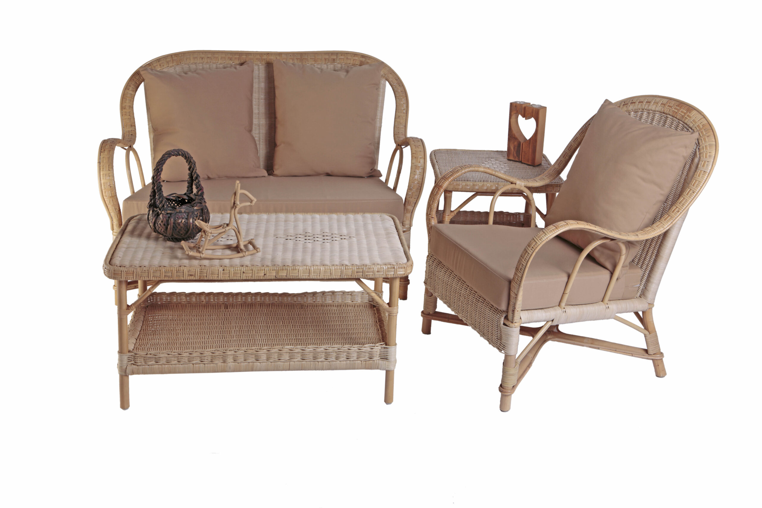 Set con struttura in Manau, seduta, braccioli e schienale intrecciato in rattan naturale